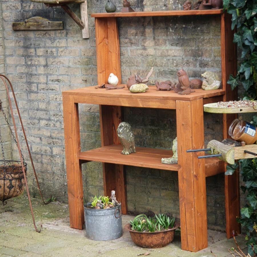 Deze oppottafel is ideaal voor tuinliefhebbers die graag met planten werken. De tafel is gemaakt van stevig hout en kan goed tegen weer en wind, waardoor hij perfect is voor gebruik buiten. Met een fijne werkhoogte helpt de oppottafel rugklachten te voorkomen, zodat u comfortabel kunt planten, oppotten en verpotten. Daarnaast biedt de tafel handige opbergruimte voor uw tuingereedschap, potgrond en plantenpotten. Zo heeft u alles binnen handbereik. Deze oppottafel past in elke tuin of op elk balkon en is een stijlvolle, functionele aanvulling op uw groene ruimte.